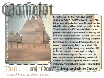 important than those intangibles like love and sharing and living life instead of accumulating things, one in which ALL people were treated as living, loving individuals NOT as things to be used or tossed aside or judged because they were different! Our vision was of a world where everyone had what they needed and everyone was respected for who they were beause we knew LOVE would do all it could to build bridges and to . . . bring everybody into Camelot!