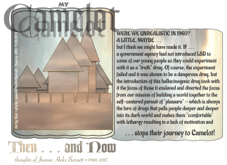 were we unrealistic In 1960? a little, maybe . . . but I think we might have made it, IF . . . a government agency had not introduced LSD to some of our young people so they could experiment with it as a “truth” drug. Of course, the experiment failed and it was shown to be a dangerous drug, but the introduction of this hallucinogenic drug took with it the focus of those it enslaved and diverted the focus from our mission of building a world together to the self-centered pursuit of “pleasure” – which is always the lure of drugs that pulls people deeper and deeper into its dark world and makes them “comfortable” with lethargy resulting in a lack of motivation and . . . stops their journey to Camelot!
