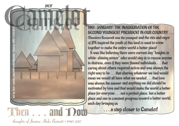 1961—January: the inauguration of the second youngest President in history of our country . . . (Theodore Roosevelt was the youngest) and the vim and vigor of JFK inspired the youth of this land to want to come together to make the entire world a better place! It was like believing there were current day “knights in white-shining armor” who would step in to rescue anyone in distress, even if they were flawed individuals . . . that caring about others required action and was always the right way to be . . . that sharing whatever we had would mean we would all have what we needed . . . that love was always the answer and anything we did should be motivated by love and that would make the world a better place for everyone . . . not a perfect place, but a better place and one in constant progress toward a better world, each day bringing us . . . a step closer to Camelot!