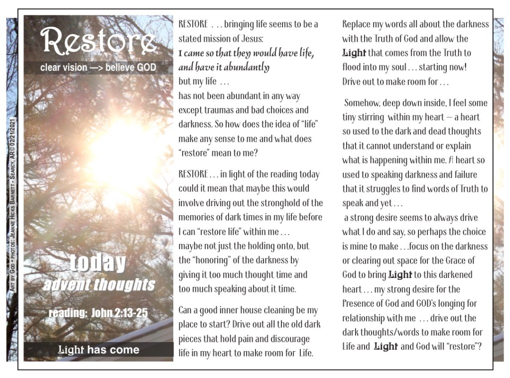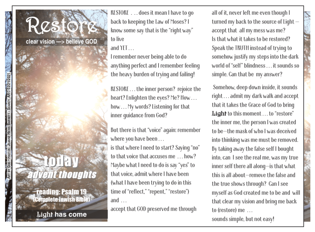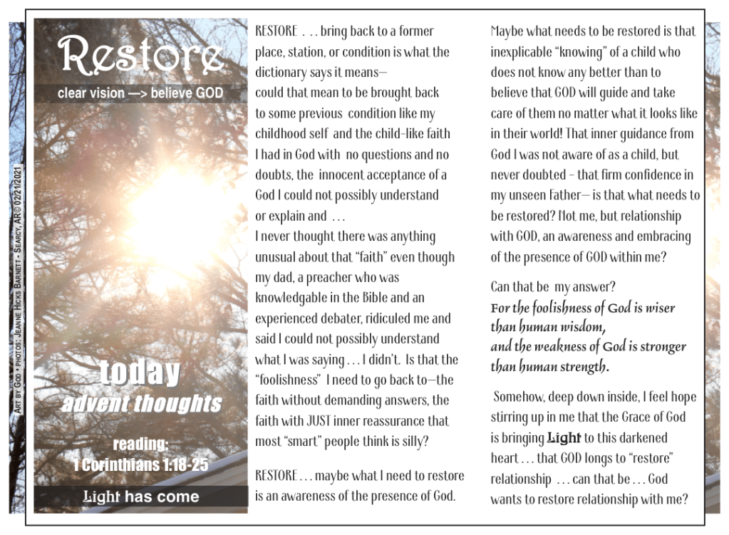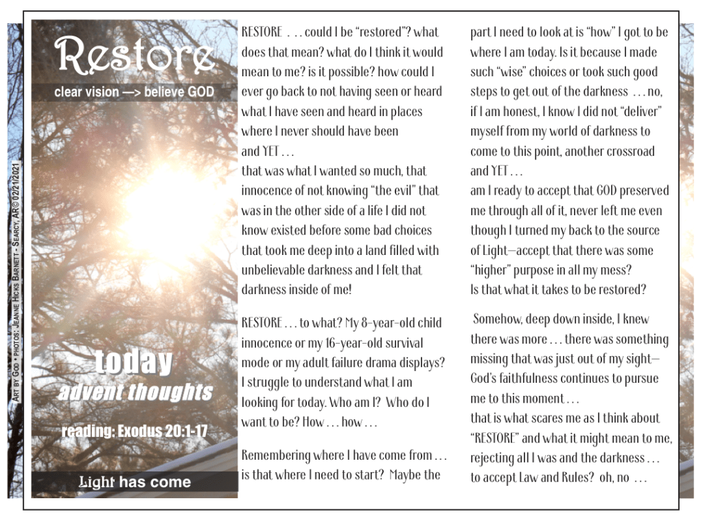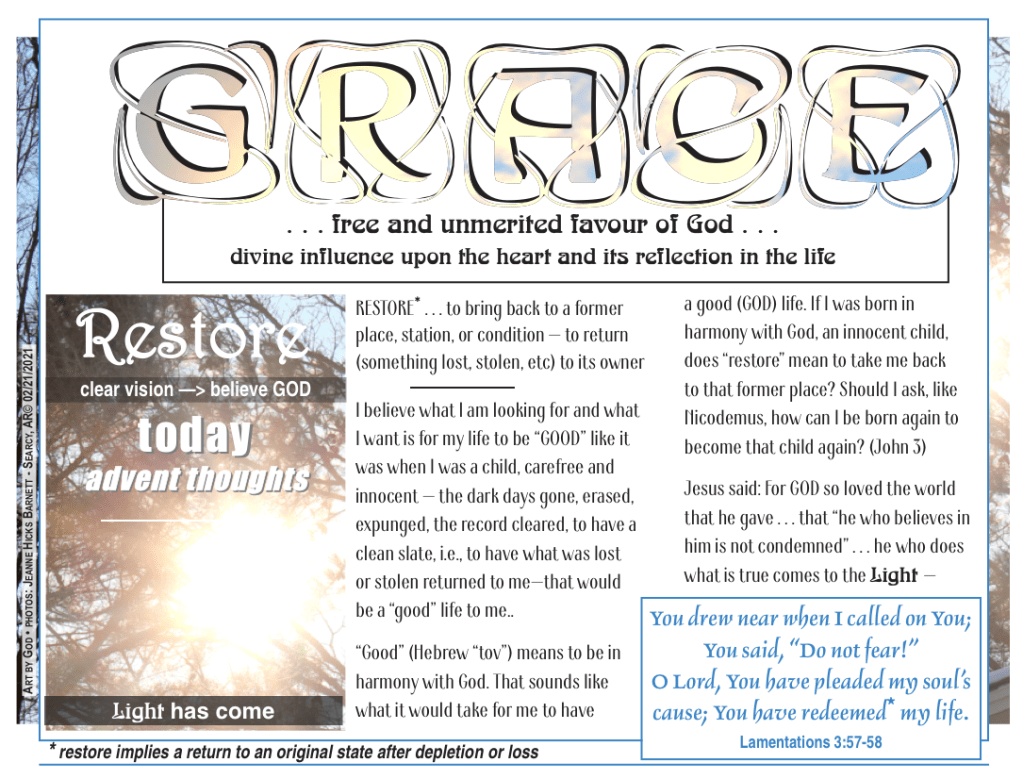 reflect . . . repent . . . restore ADVENT draws attention to the coming of LIGHT and that can mean different things to different people. SO I decided to explore what each of those “words” mean to me within the context of the scripture references given to Advent 2021. My plan is to write five posts based on the references with the last one being a kind of summary of that word for me. It seems like a good idea in this time of so much chaos for each of us to explore what we think and what we believe. GOD . . . ME . . . LIFE . . if we could respectfully exchange our thoughts and beliefs, we might find that we each could gain.