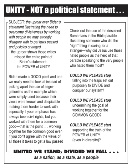 the uproar over Biden’s statement illustrating the need to overcome divisiveness by working with people we may strongly disagree with to get laws passed and policies changed . . . the uproar shows those critics missed the entire point of Biden’s statement: the POWER of UNITY —